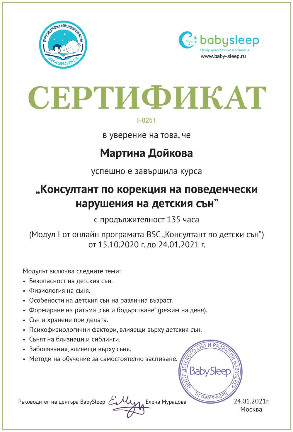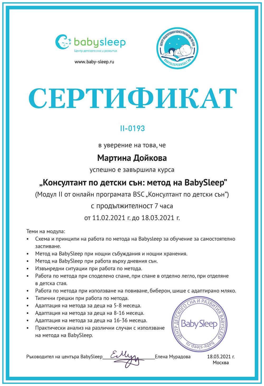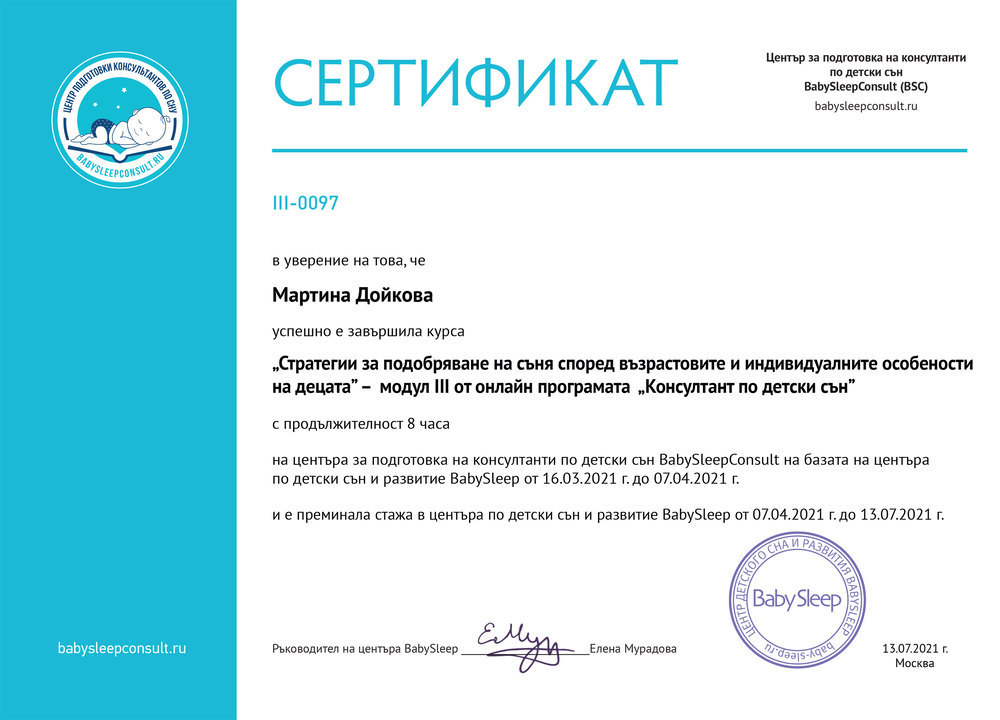 Точно тогава моя приятелка ми сподели, че за първи път в България предстои обучение за консултанти по детски сън. Не се поколебах и веднага се записах! Така през 2021 година успешно се сертифицирах и оттогава работя активно в тази сфера. В продължение на повече от две години бях част от екипа на „Нани, нани, бебе“, където натрупах безценен опит, помагайки на много семейства да постигнат спокойни нощи и по-добър ритъм в ежедневието си.